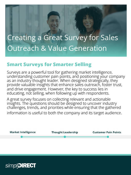 This guide from SimplyDIRECT explores how strategically crafted surveys can drive smarter sales outreach and foster meaningful customer engagement. Learn how to gather actionable insights, position your company as a thought leader, and create trust-based conversations that convert.